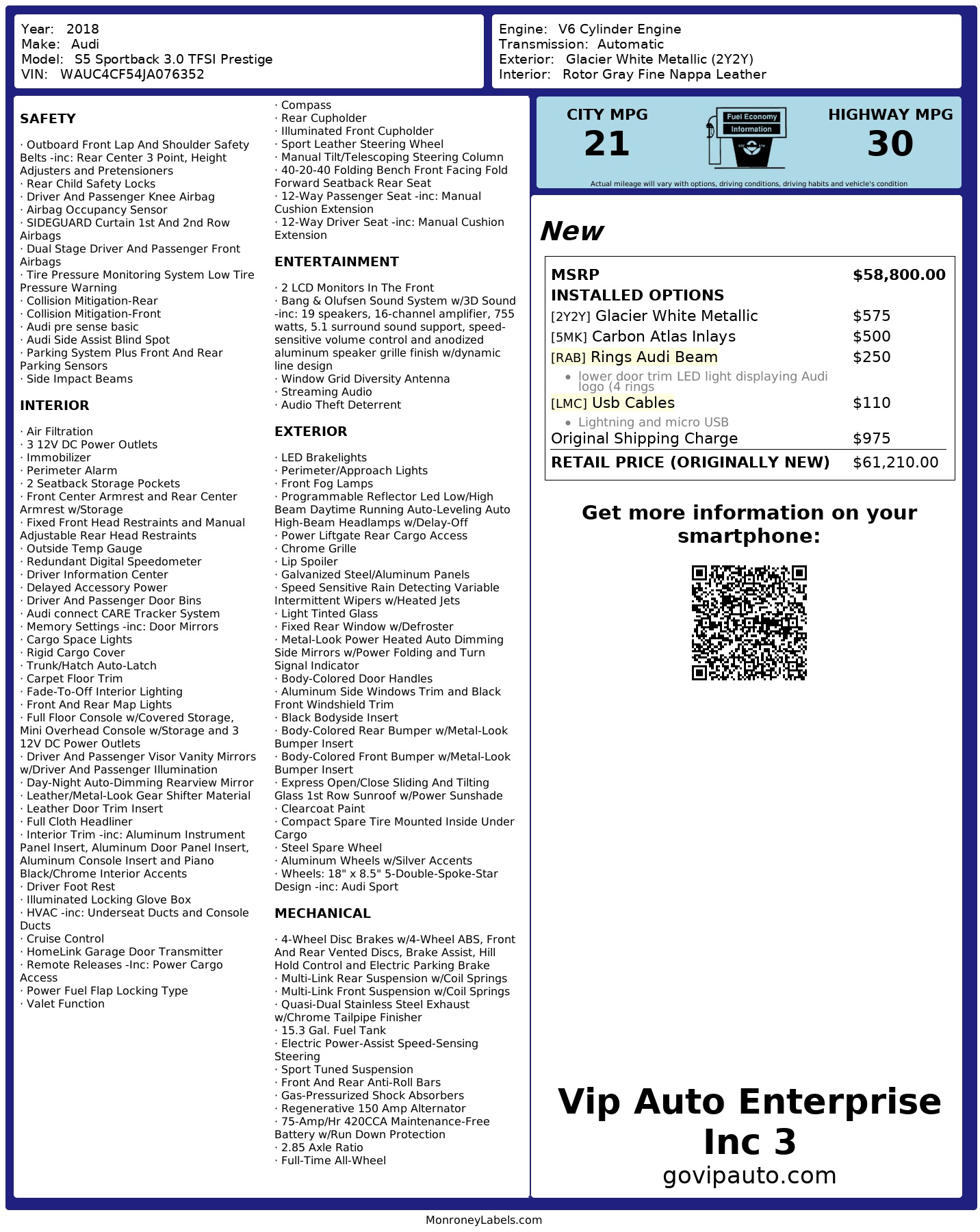 VIP Auto Enterprise Inc. site uses AI generated Vehicle Descriptions for some vehicles, a program used to automatically generate vehicle descriptions for vehicles using the system information from the VIN decoder vehicle options and advises that the details may not be fully accurate.